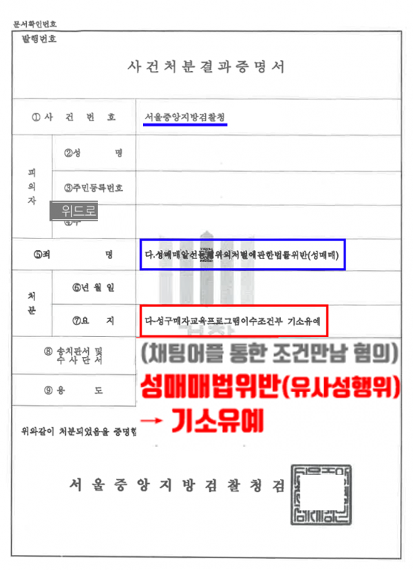 - 경찰조사를 무사히 마친 이후 사건은 서울중앙지방검찰청으로 송치되었고, 이때 김경환 대표변호사는 의뢰인 앙톡성매매혐의에 대한 억울한 부분을 이와 유사한 처분 사례를 근거로 선처가 가능한 사안임에 대해서 자세히 작성한 변호인의견서와 관련 증거자료, 참고자료들을 검찰에 제출하면서 조력을 아끼지 않았는데요.