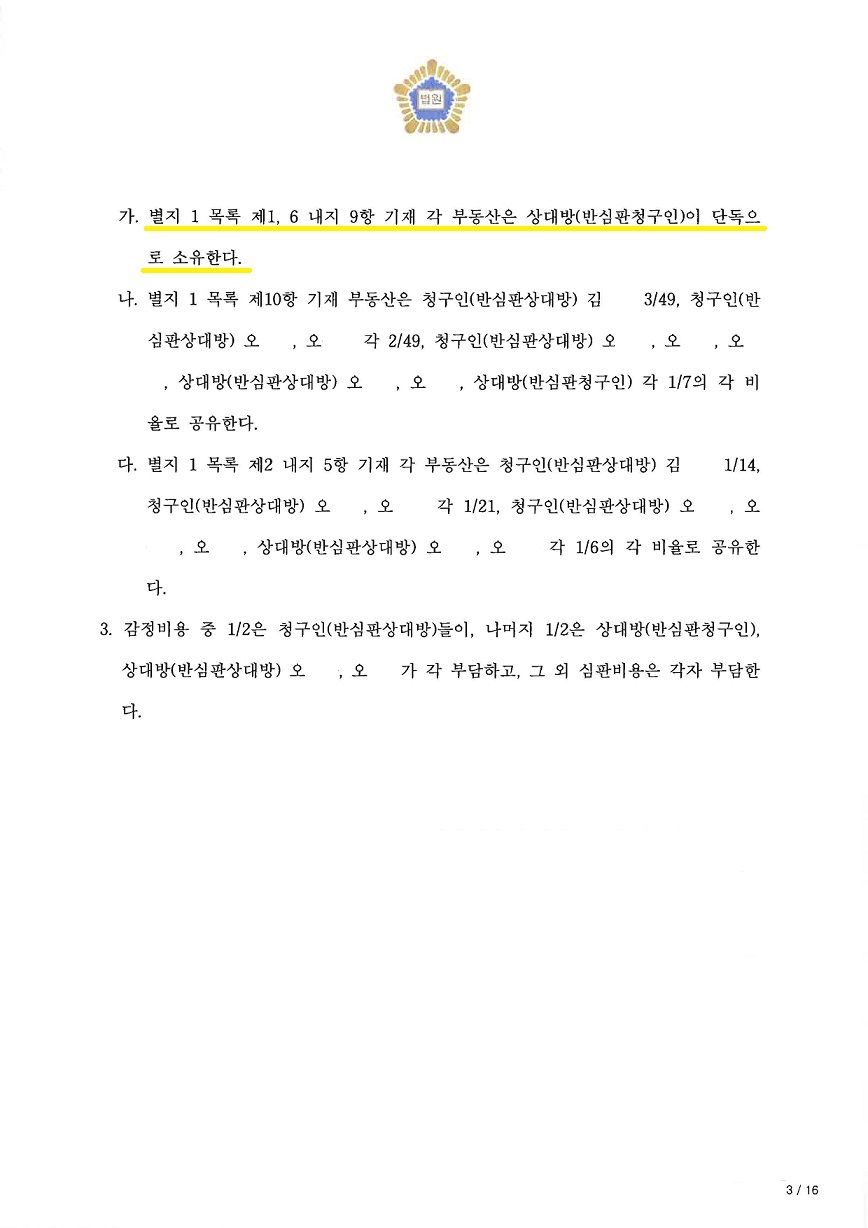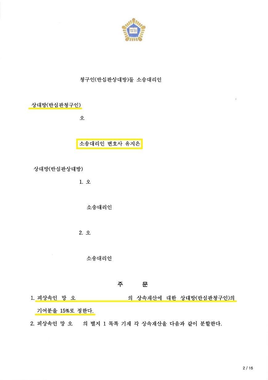 2년에 걸친 긴 다툼 끝에 결국, 의뢰인의 기여분으로 15%를 인정받았고, 농사를 짓고 있는 제일 가치가 높은 토지 5필지를 단독으로 소유할 수 있었으며, 다른 형제들에게 대금으로 정산하는 대신 농사를 짓지 않는 다른 토지들을 분할 하는 방법으로 성공적으로 판결이 선고되어 의뢰인이 매우 만족한 사안입니다.