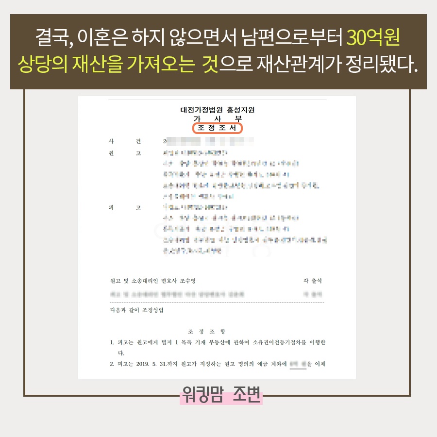 결국 이 사건은 '이혼은 하지 않고 상대방인 남편으로부터 30억원 상당의 재산을 가져오는 것' 으로 혼인관계는 유지하고 재산 관계만 정리하는 것으로 조정이 원만히 마무리됐습니다.