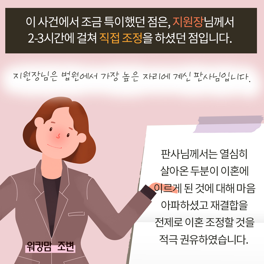 지원장님은 의뢰인과 남편분이 경제공동체로서 쌍방 협력으로 많은 재산을 형성하며 열심히 살아왔는데 이혼에 이른 것을 안타깝게 생각하셨고 이에 직접 조정을 진행하기도 했습니다.