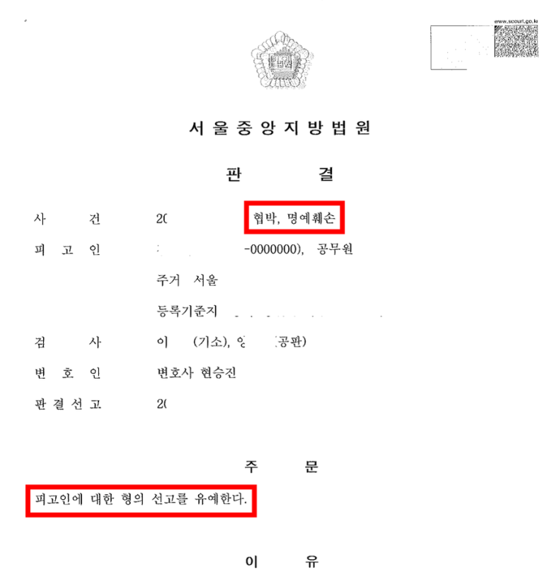 결국 고소인은 의뢰인은 협박 및 명예훼손 혐의로 고소하였고, 검사는 경위야 어찌 되었든 의뢰인이 현행법을 위반한 것은 분명하다는 이유로 의뢰인을 협박 및 사실적시명예훼손으로 약식기소 하였습니다.