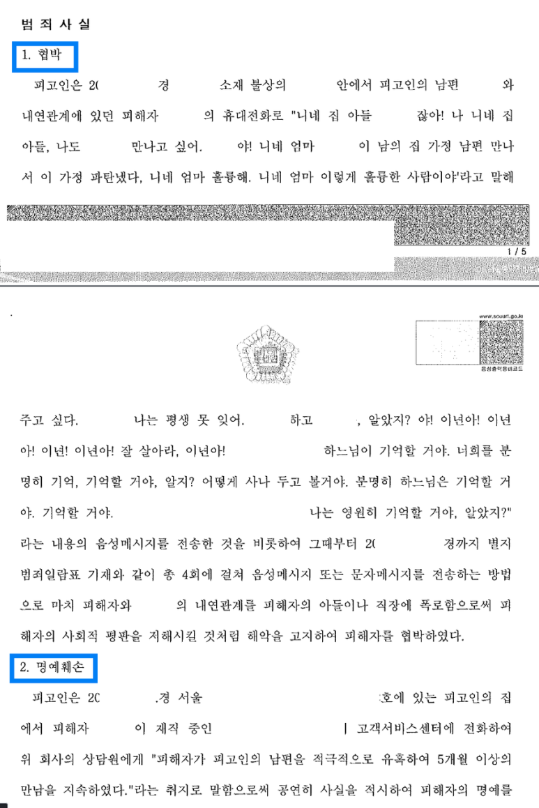 이에 의뢰인은 내연녀(이하 '고소인')의 전화번호와 그녀의 자녀 이름을 알아내 자녀나 재직 중인 회사에 불륜 사실을 알릴 것처럼 문자 또는 음성메시지를 이용해 협박하였고, 내연녀의 회사 고객상담센터에 전화를 하여 고소인이 자신의 남편을 유혹하여 부적절한 관계를 가지고 있다는 내용의 말을 하였습니다.