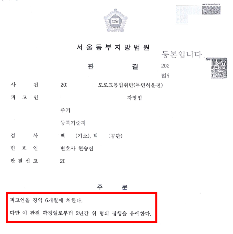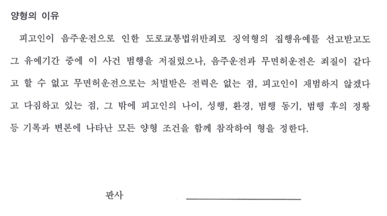 또한 의뢰인의 이 사건 무면허운전은 생계를 위해 부득이 1회에 한하여 이루어진 것이라는 점을 증명하기 위해 관련 증거를 수집하여 제출하고, 그럼에도 불구하고 의뢰이니 자신의 잘못을 진심으로 반성하고 있다는 점과 다시는 무면허운전을 하지 않을 것이라는 점, 비록 집행유예 기간 중이고 음주운전과 무면허운전 모두 교통범죄이기는 하나 죄질이 다른 범죄라는 점 등 의뢰인에게 유리한 정상(情狀)을 적극적으로 주장하고 입증하였습니다.