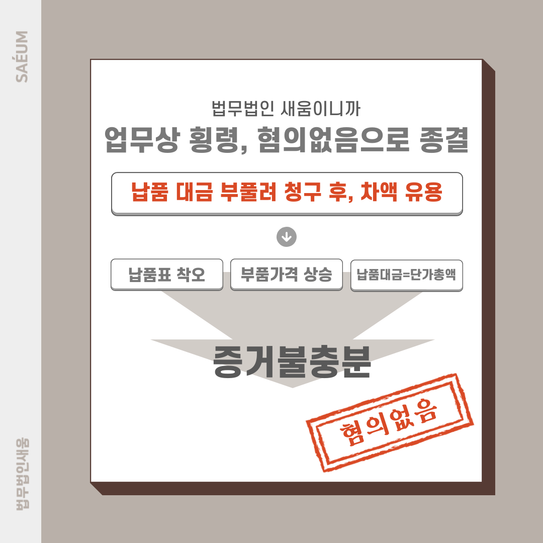 법무법인 새움에서는 피의자의 변호를 맡았고 혐의 성립이 되지 않도록 조력 더했습니다. 해당 문제 행위는 두 사람이 납품 표를 잘못 제출하여 착오가 생긴 것이라면 주장하였고, C씨에게 발행한 전자세금계산서를 확인해 볼 결과 정상 납품 금액과 같이 청구된 것을 확인했고, 이에 피의자들의 혐의를 입증할 만한 증거가 없음을 주장하였습니다.