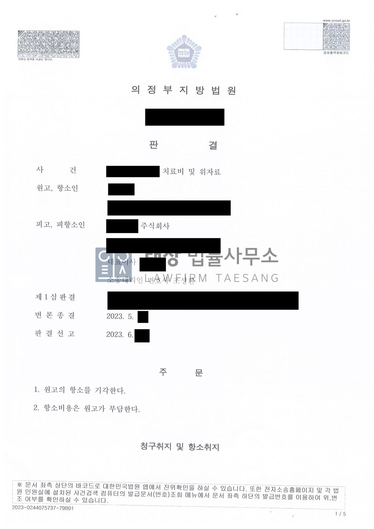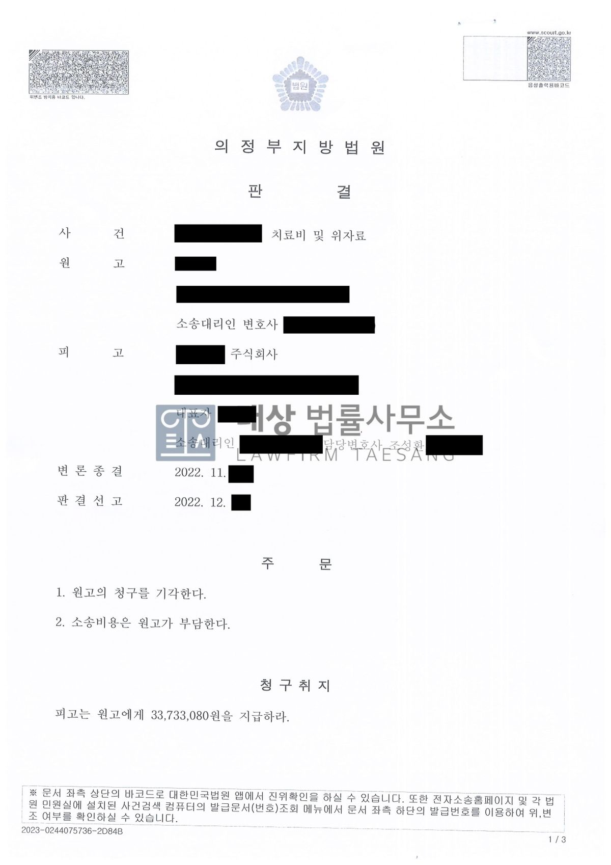 - 위와 같은 노력으로 법원은 원고가 사건의 발생 및 그로 인한 손해를 완전히 입증하지 못하였다고 하면서 피고 전부 승소 판결을 하였습니다.