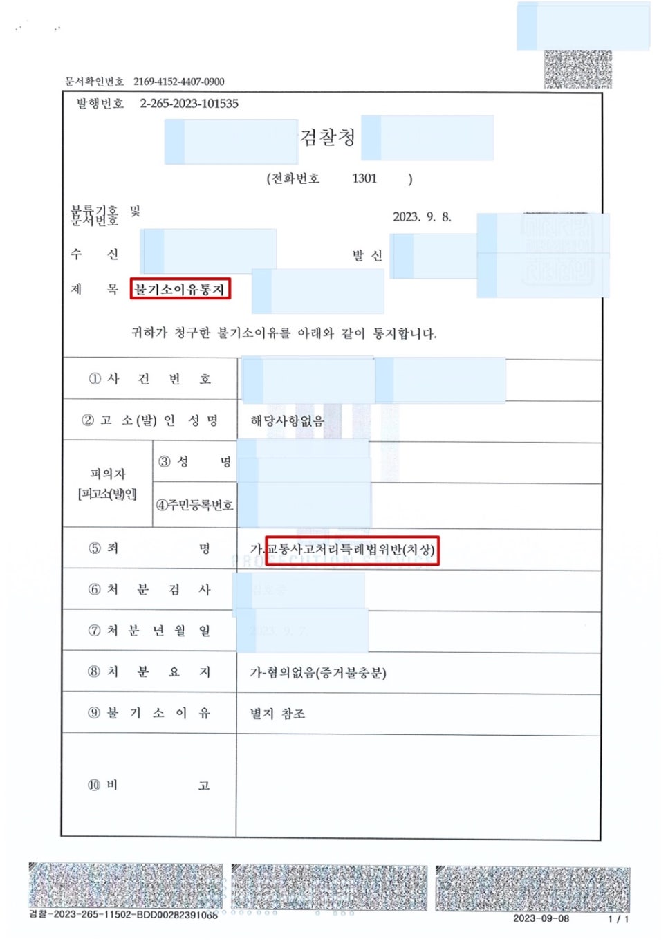 검찰은 '피의자가 교통사고 당시 기왕에 없었던 뇌전증이 발생된 것으로 본건 교통사고가 운전자의 과실에 해당한다고 볼 수 없다'하여 교특치상 혐의없음 처분을 하였습니다.