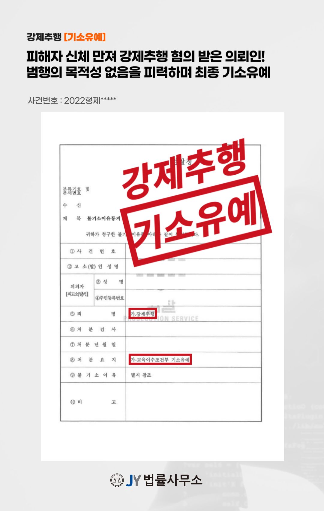 이와 같은 변호인의 노력에 따라, 의뢰인은 강제추행 혐의에 대해 기소유예의 처분을 받고 무사히 사건을 종결시킬 수 있었습니다.