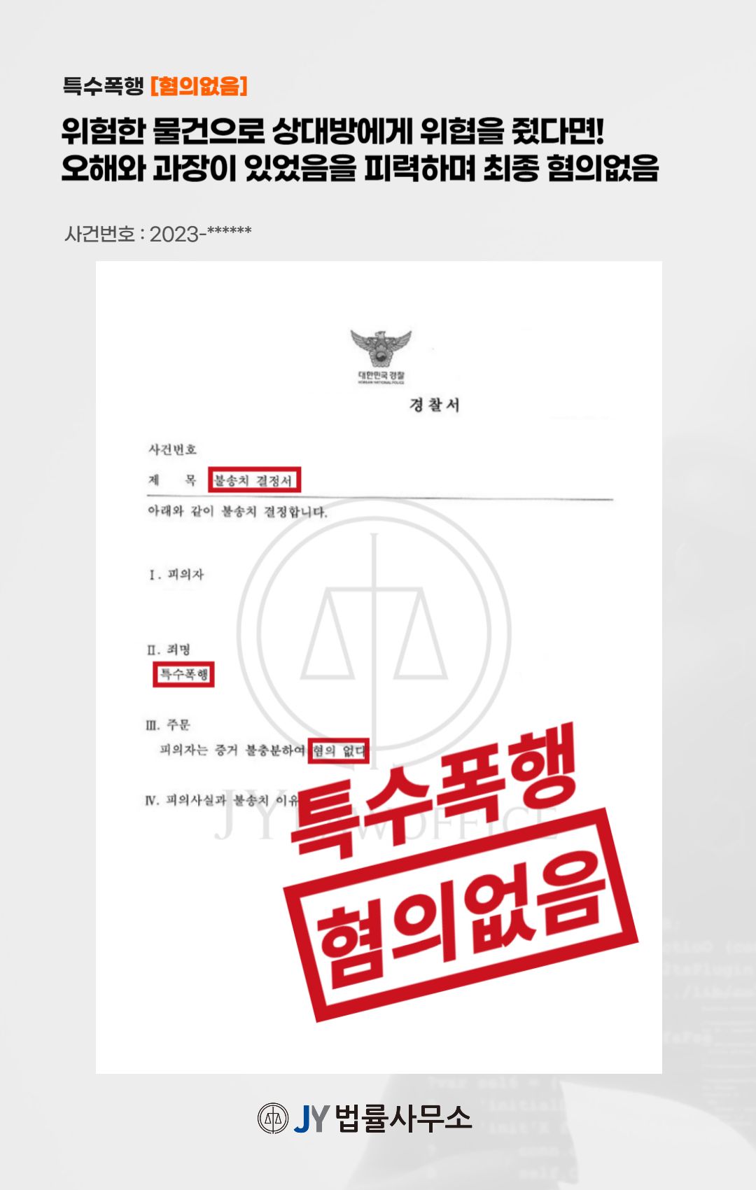 이와 같은 변호인의 조력에 의뢰인은 수사 단계에서 혐의없음의 처분을 받아 재판 없이 사건을 마무리할 수 있었습니다.