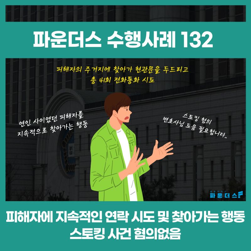 의뢰인은 연인 관계인 고소인의 집에 찾아가 현관문을 두드리고 총 41회에 걸쳐 전화를 건 점 그리고 카톡 메시지를 10회에 걸쳐 전송했다는 이유로 스토킹 혐의로 연루되어 파운더스 변호인의 법적 조력을 요청하였습니다.