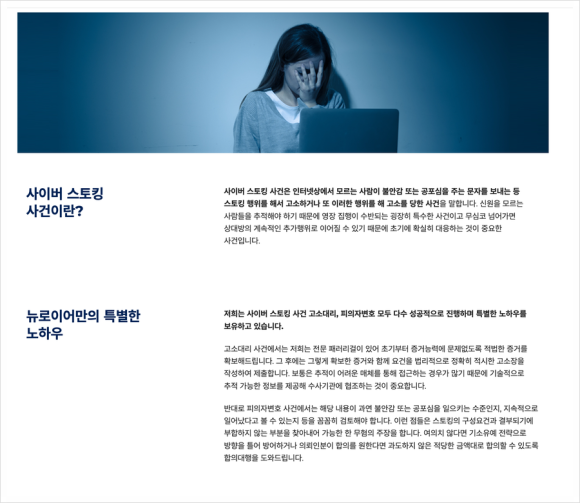 스토킹, 협박 등의 사건을 전담하는 사이버 범죄 특화 로펌 뉴로이어입니다.