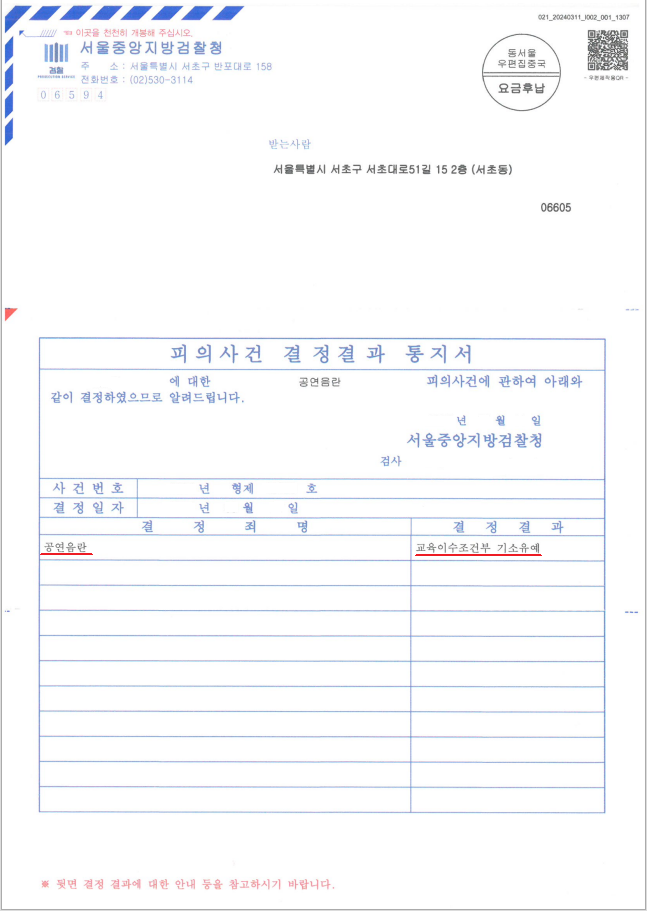 이에 서울중앙지방검찰청은 의뢰인님에게 "기소유예처분"을 내렸습니다.