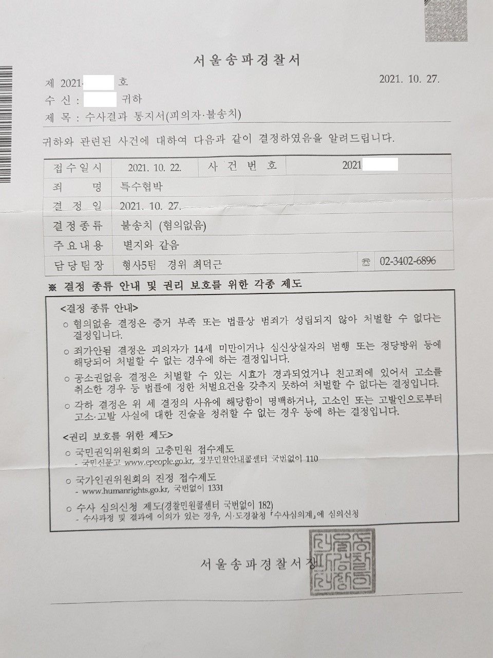 본 변호인의 의견대로 경찰은 피의자에게 불송치(무혐의)처분을 내려주게 되었습니다.