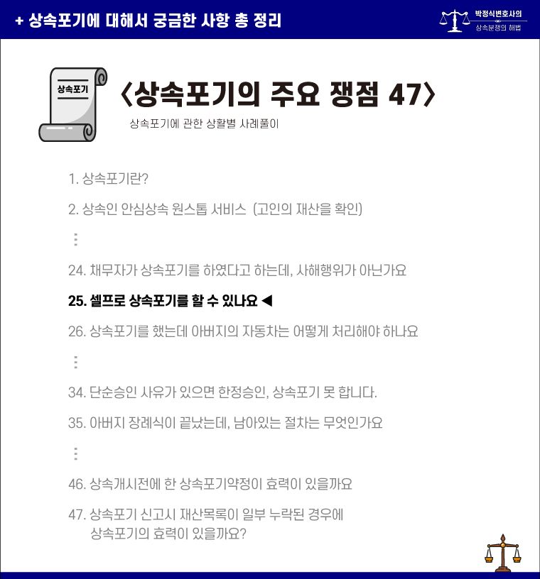 셀프로도 상속포기를 신청할 수 있고 상속포기의 경우 한정승인보다 간편해서 셀프로 하기에도 용이합니다.