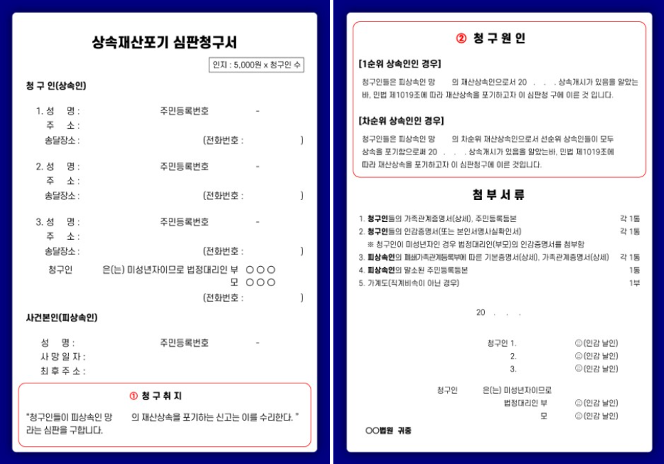 첨부해드린 상속재산포기 심판청구서 양식의 빈칸을 채워서 작성하면 되는데, 청구취지와 청구원인 기재례를 아래와 같이 안내드립니다. (*번호는 임의로 부여한 것이며 작성 순서와는 상관이 없습니다.)