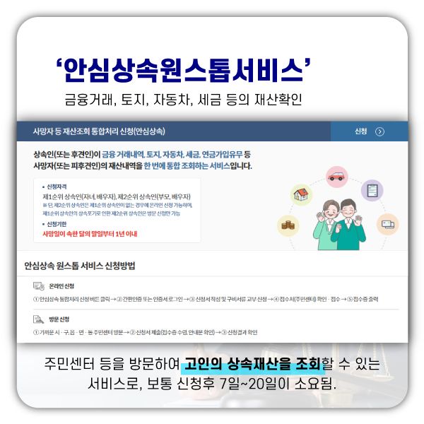안심상속 원스톱 서비스는 상속인이라면 누구든지 주민센터에 가셔서 고인의 상속재산을 조회할 수 있는 서비스로, 신청접수를 하신 날로부터 보통 7일 ~ 20일 기간이 소요됩니다.
