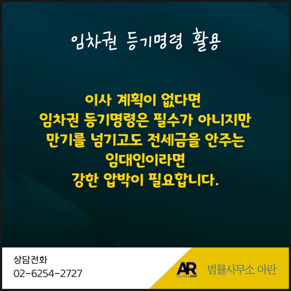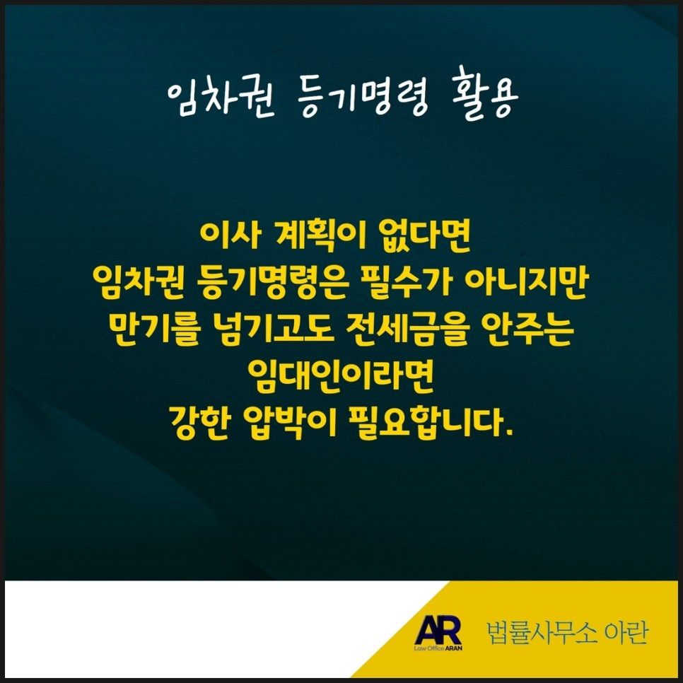다만 만기를 넘기도록 전세금을 안 주는 임대인이라면 강한 법적 압박이 필요하기 때문에 이사 여부를 불문하고 임차권등기명령을 신청하시는 것을 권유드립니다.