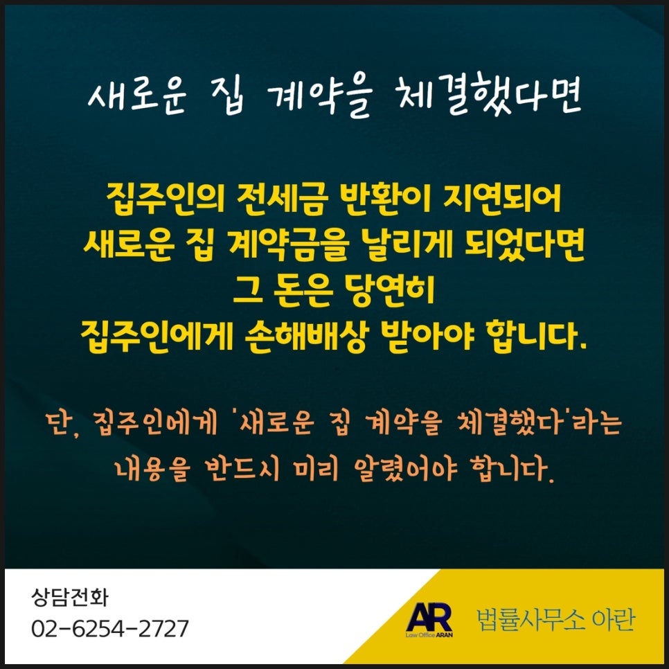 따라서 임차인은 약속된 날짜에 전세금을 돌려받을 수 있다는 전제 하에 얼마든지 새로운 집을 구하셔도 됩니다.