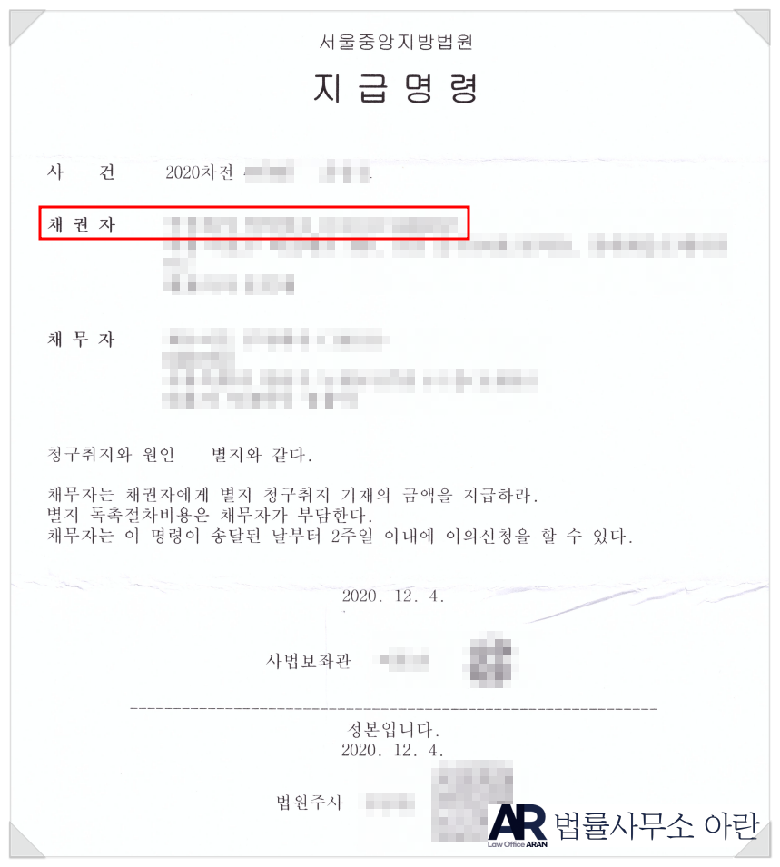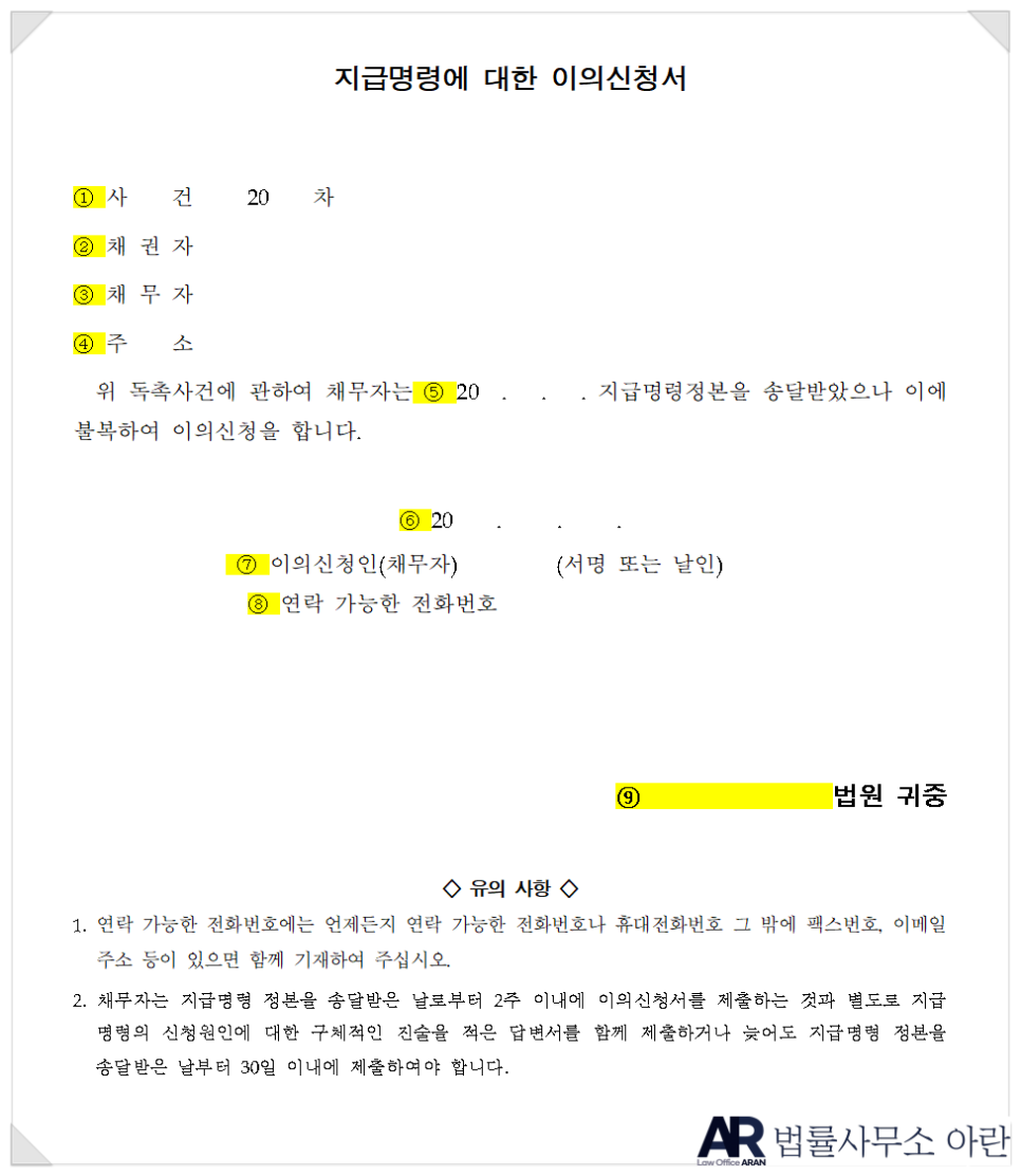 지급명령을 받은 날로부터 반드시 2주 안에 법원에 이의신청서가 접수되어야 합니다.