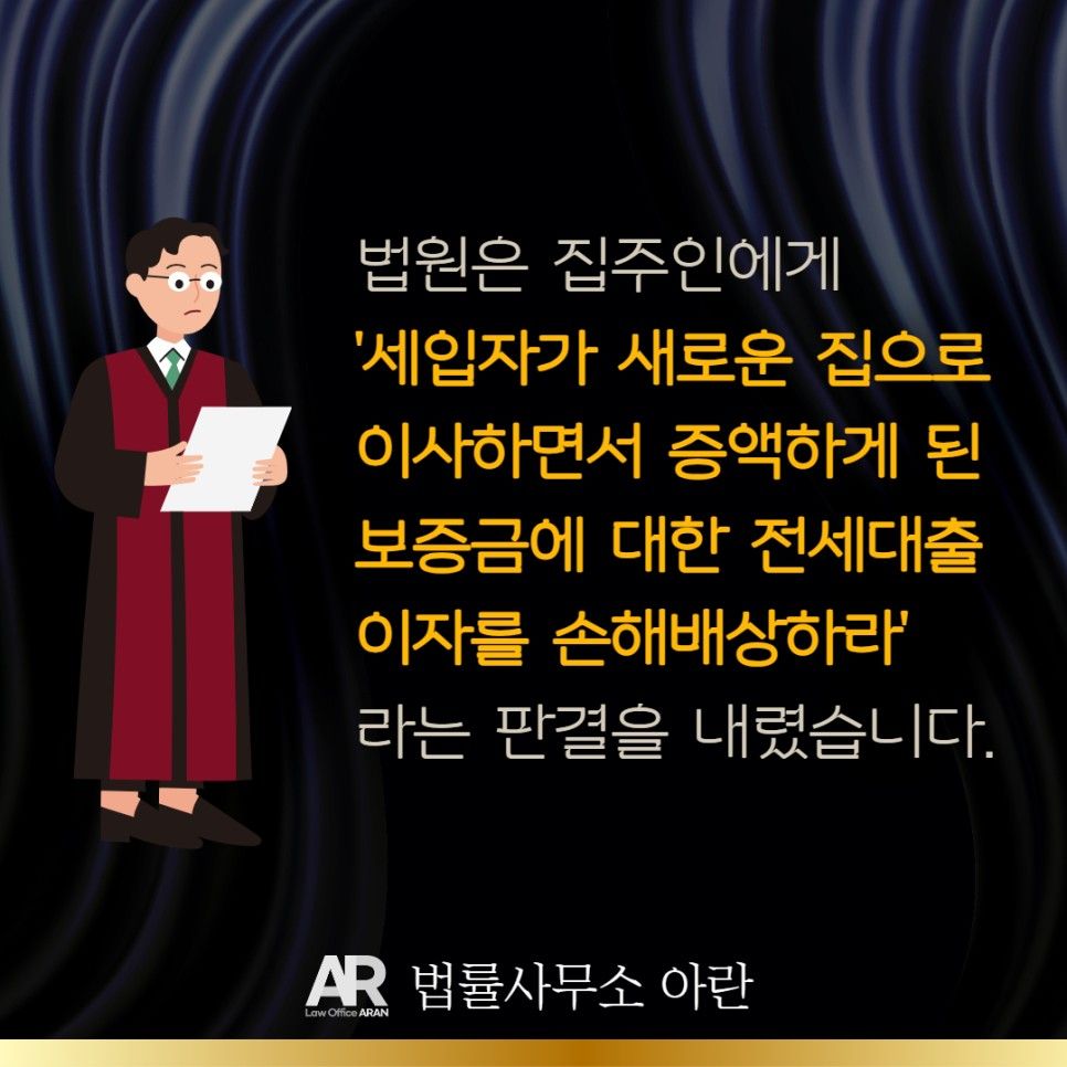 이 사건은 세입자가 증액된 보증금에 대한 전세대출이자를 배상받았다는 점에 큰 의미가 있는 판결입니다.