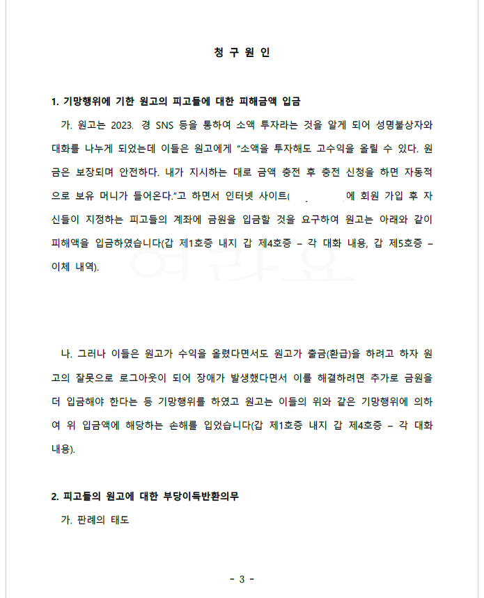 이 사건에서도 의뢰인은 투자사기를 당하여 피고 법인에게 피해액을 입금하였고 이를 돌려받기 위해 저를 찾아오셨습니다.