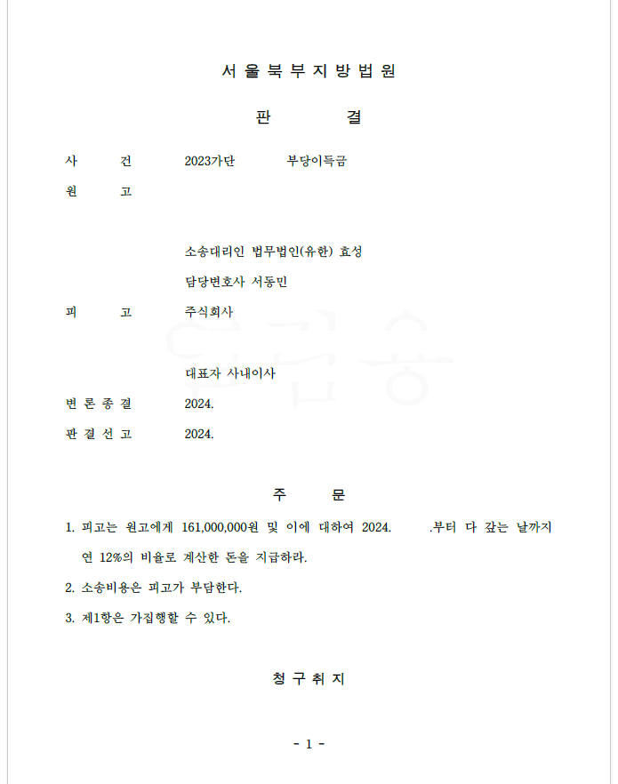 저는 즉각 입금 받은 법인을 피고로 하여 민사소송 부당이득반환청구소송을 제기하였고 법원은 원고 승소 판결을 선고하여 의뢰인은 피해액을 반환받았습니다.