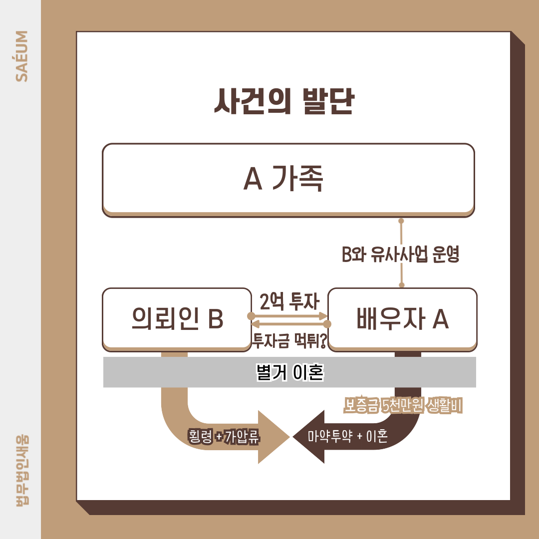 이에 의뢰인 B씨는 법인 자금을 마음대로 사용하는 것은 횡령이라며 A씨가 마음대로 사용할 수 없게 가압류를 걸어두었고, A씨는 B씨의 대마초 투약 사실을 경찰에 신고했으며 바로 B씨를 상대로 별거이혼소송을 진행하게 됩니다.