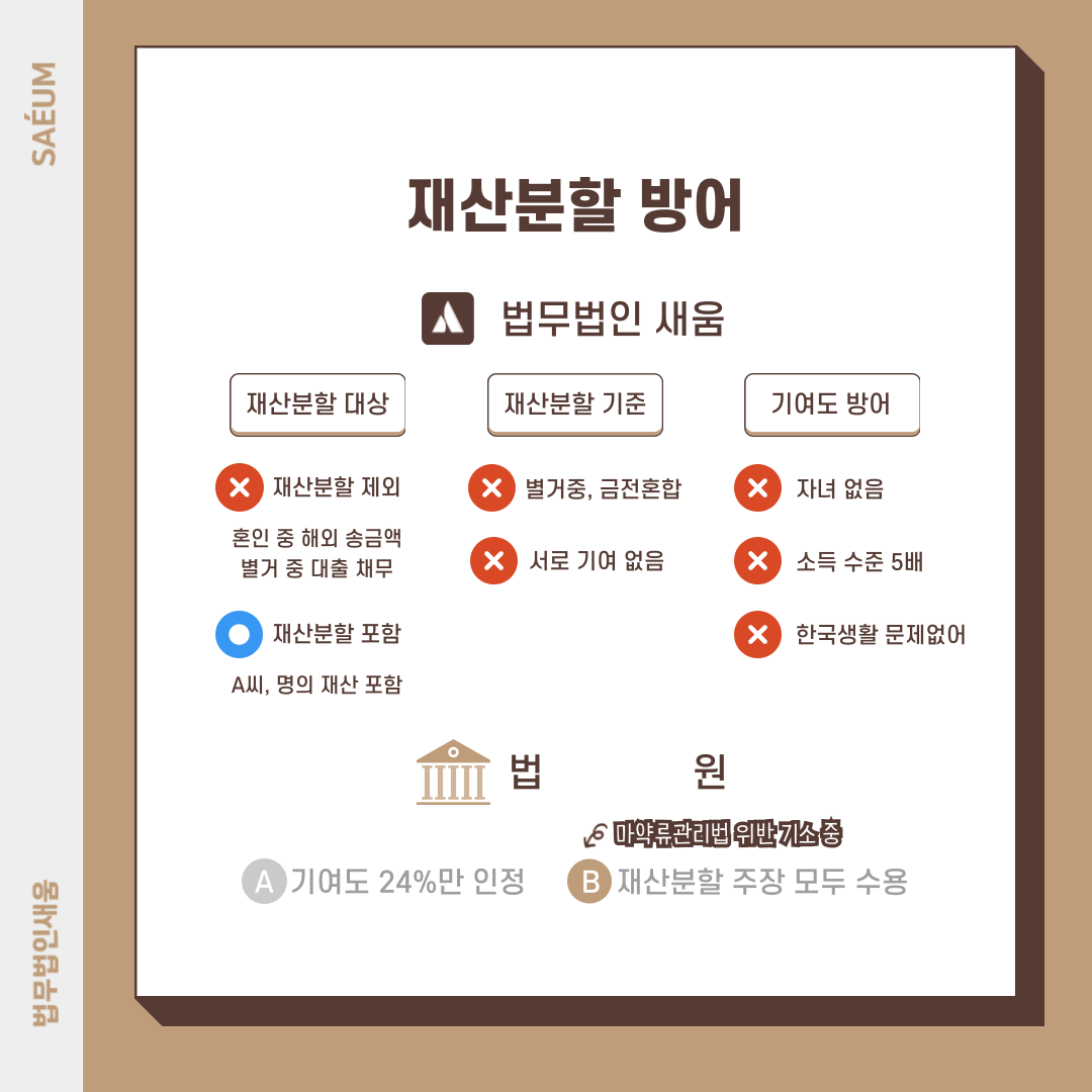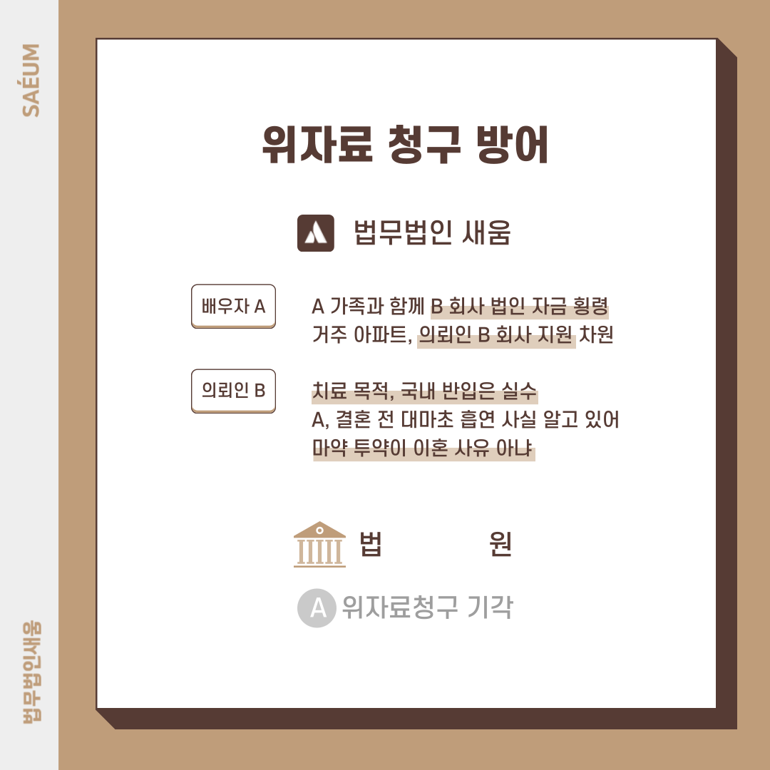 이에 법무법인 새움에서는 해당 사건의 경우 A씨의 가족이 의뢰인과 함께한 법인 자금을 횡령하는 등의 문제로 인해서 파탄이 나게 되었으며, A씨가 거주했던 아파트는 B씨의 회사에서 지원했다는 점을 강조하였습니다. 또한 의뢰인 B는 재미교포로 치료를 위한 목적으로 합법적으로 마약을 취득했으며, 국내 반입은 그저 실수로 인한 것임을 주장했습니다. 또한 A씨는 결혼하기 전부터 대마초 흡연 사실을 알았으나 이를 제재하거나 말리지 않았다는 점을 들어 마약이혼 사유가 아님을 밝혀 위자료청구방어를 하였습니다.