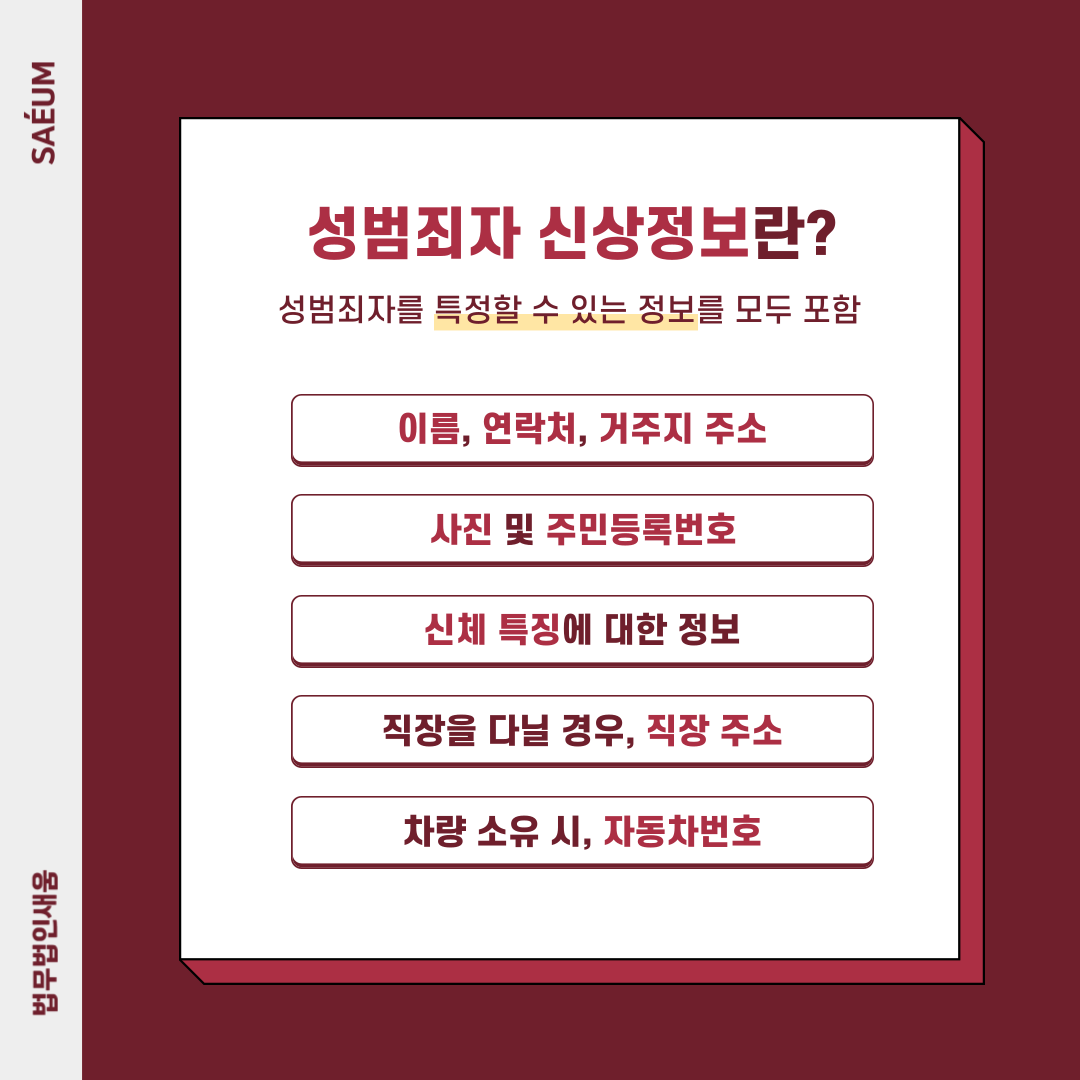 성범죄자 신상정보로 등록하는 정보는 성범죄자를 특정할 수 있는 정보를 모두 포함하고 있습니다. 이름과 연락처, 사진, 주민등록번호, 신체 특징에 대한 정보, 거주지 주소, 직장이 있을 때 직장 주소, 차량을 소유했을 경우 자동차 번호까지 확인할 수 있습니다. 이처럼 누구나 성범죄자를 인지할 수 있도록 필요한 정보를 제공하고 있습니다.