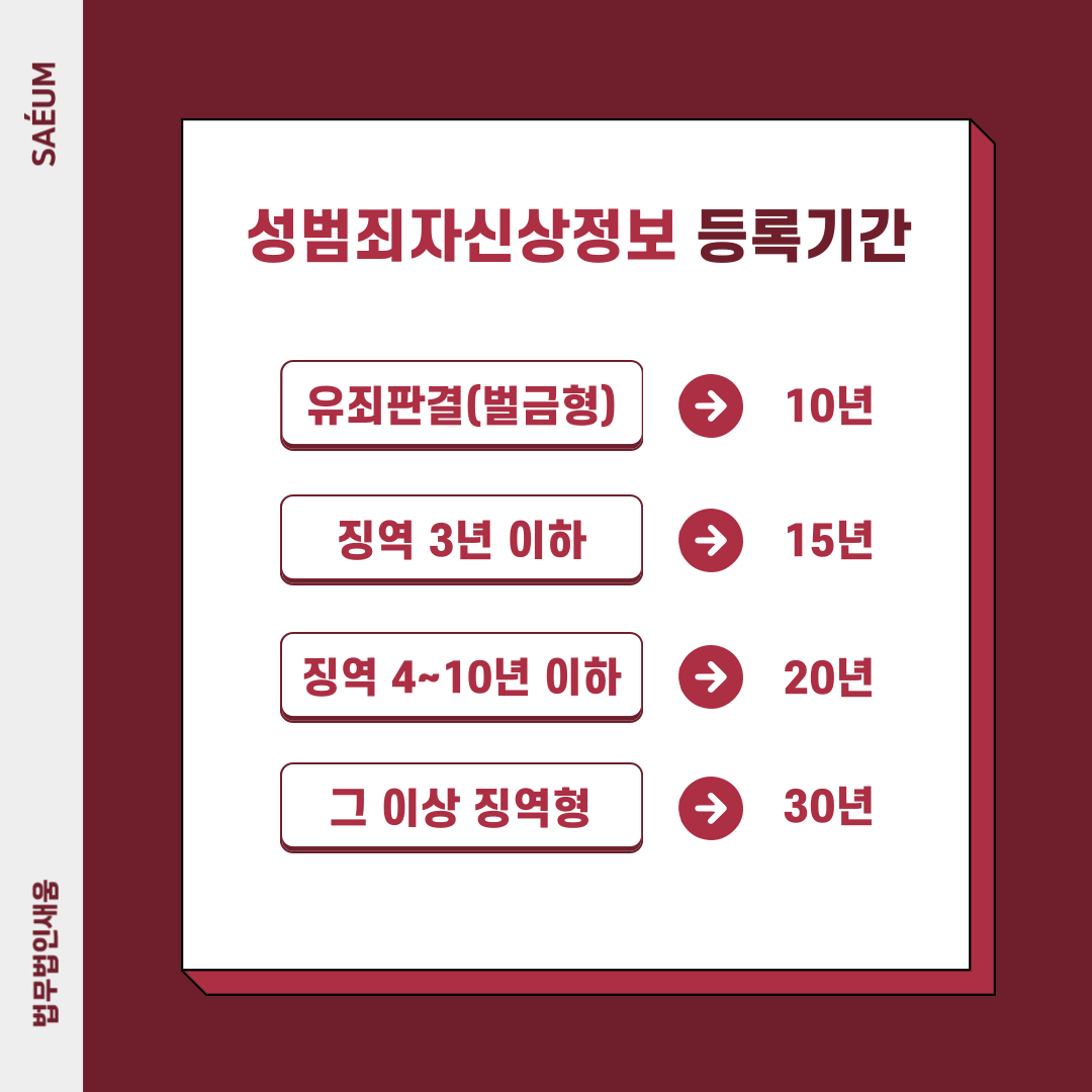 성범죄자 신상정보 등록 기간은 어떤 형법 처분을 받았느냐에 따라 다르게 결정됩니다. 약식명령을 받는 때도 있고, 유죄 판결을 선고받은 경우는 10년, 법원으로부터 3년 이하의 징역 판결을 받으면 15년, 4년 이상 10년 이하의 징역 판결을 받은 경우는 20년입니다. 그리고 이 이상의 징역형, 법원으로부터 11년 이상의 징역 판결을 받은 경우는 30년간 성범죄자신상정보로 등록됩니다.