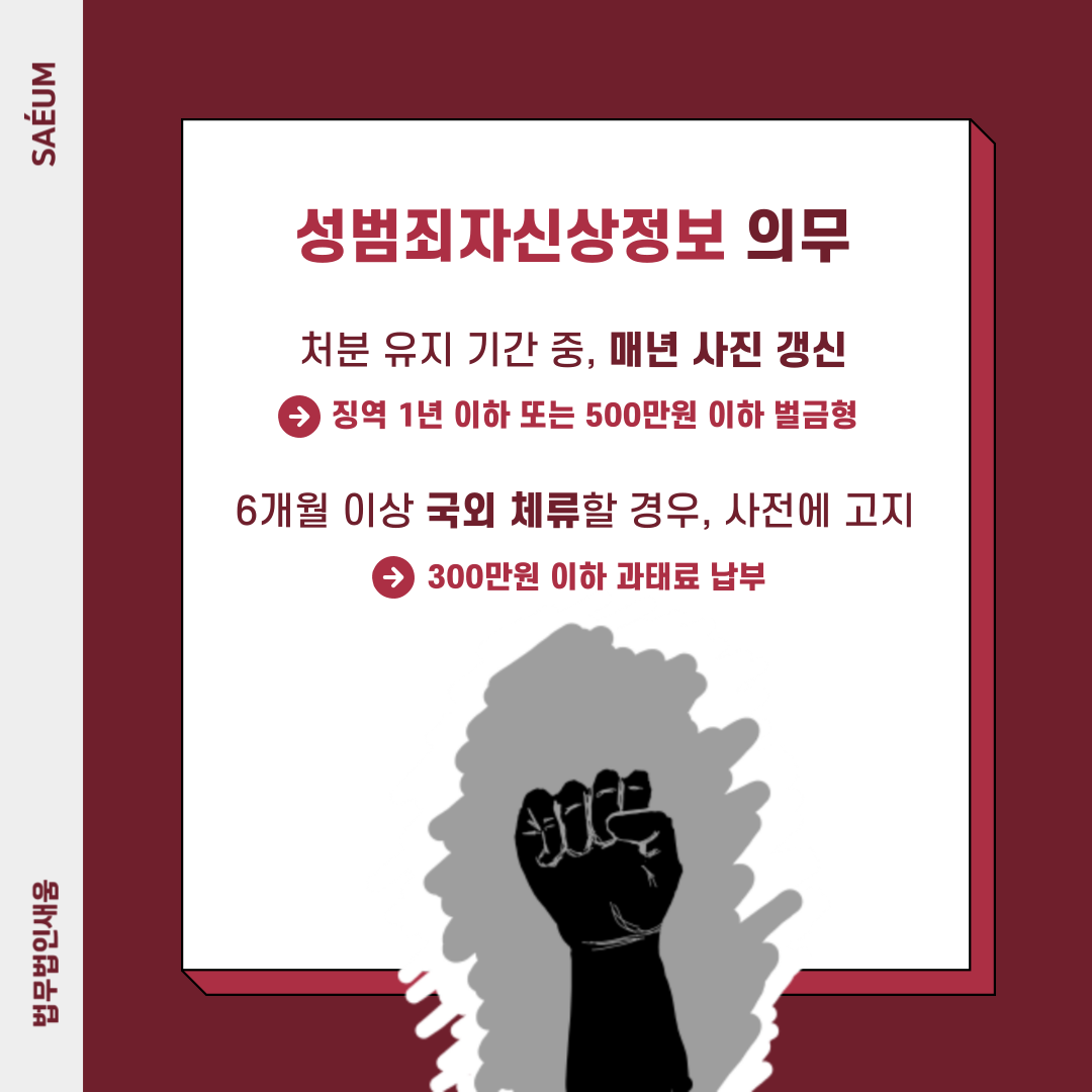 신상정보등록 처분이 유지되는 동안에는 매년 관할 경찰서에 출석해 동안 사진을 갱신해야 합니다. 또한 신상정보등록 정보 중 변경 내용이 있을 때, 그 사실을 관할 경찰서에 반드시 알려야 합니다. 만일 이를 지키지 않을 경우, 관련 법 규정에 따라 1년 이하의 징역 또는 500만 원 이하의 벌금에 처할 수 있습니다.