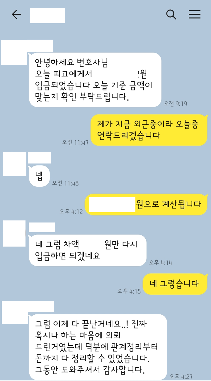 저는 즉각 대여금청구소송을 제기하였고 법원은 승소 판결을 선고하였으며 피고는 대여금 및 이자, 소송비용까지 의뢰인에게 입금하였습니다.