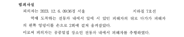 A씨는 2023. 12. 6. 09:36경 출근하는 길에 지하철에서 내리다가 마음에 드는 여성 B씨를 발견하고 B씨의 뒤로 다가가 B씨의 엉덩이를 2회 움켜잡았습니다.