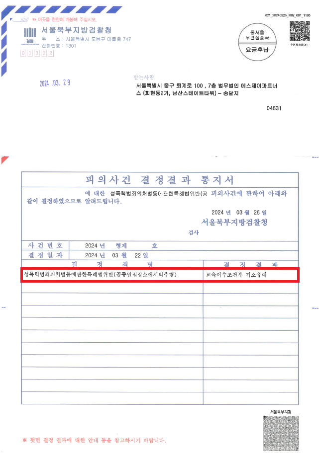 이러한 저의 조력을 바탕으로 A씨는 '기소유예' 처분을 받음으로써 파렴치한 성추행범으로 낙인찍힐 위기에서 벗어날 수 있었습니다.