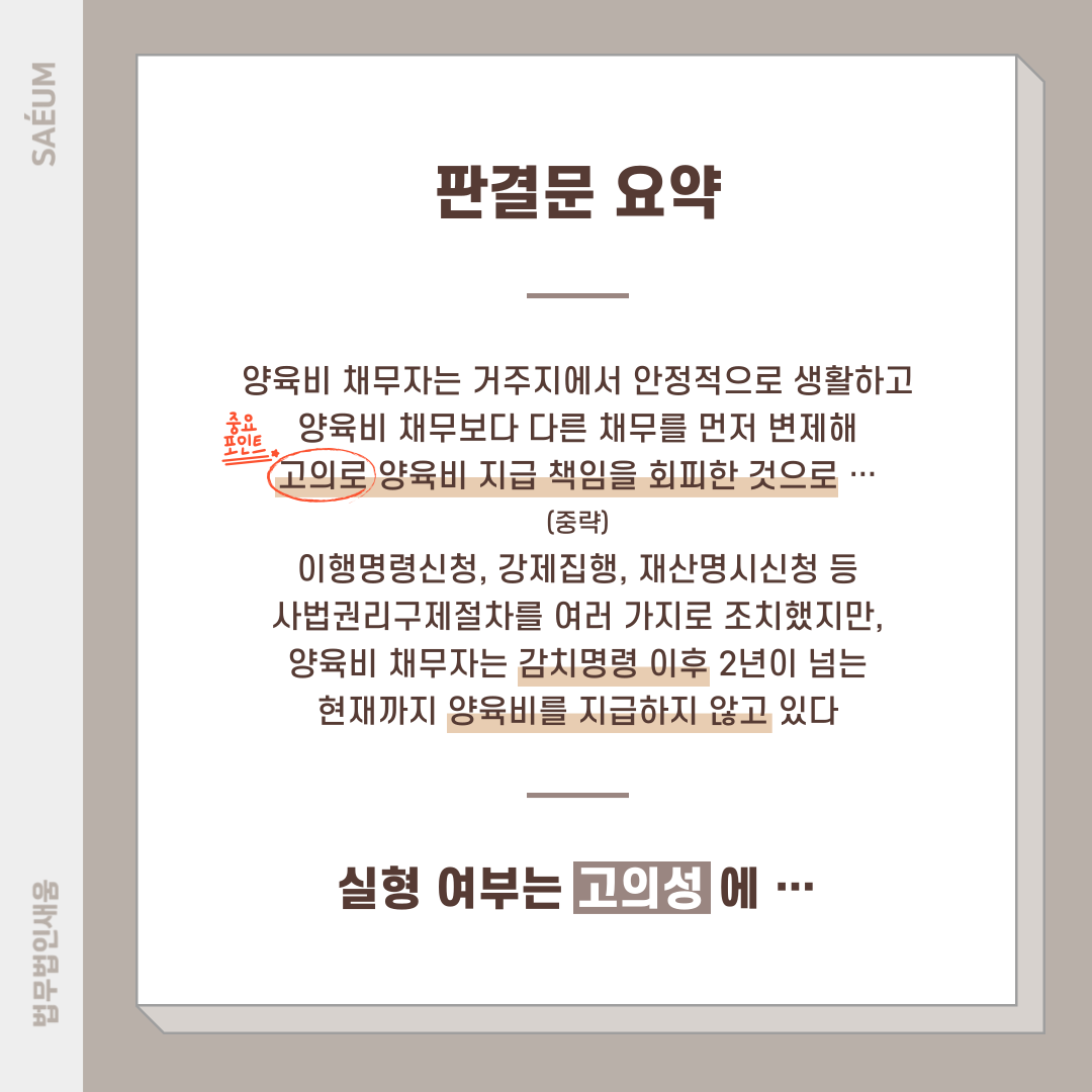 양육비 채무자는 일을 하지 않아, 줄 수 있는 양육비가 없다는 취지로 주장해 왔지만, 법원은 "경제적 어려운 상황을 호소하고 있지만, 이 사건 양육비 채무 외에 별다른 채무가 없고, 부모의 주거지에서 안정적으로 생활하고 양육비 채무보다는 다른 채무를 먼저 변제해 온 것으로 보여 고의로 지급 책임을 회피한 것으로 보인다"라고 판시했습니다.