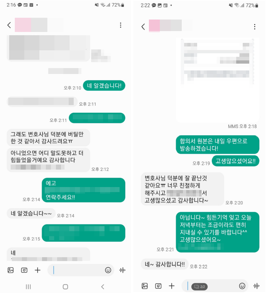 우연히 알게 된 외도사실에 부부싸움도 하고 힘든 시간을 보내다가 남편이 해외발령까지 받아 해외로 나갔으나, 그 와중에도 계속적으로 상대방으로부터 텔레그램 연락이 왔고, 그 사실을 재차 발각하여 법무법인 기세 변호사사무실을 찾아서 합의대행을 의뢰해 주셨습니다.