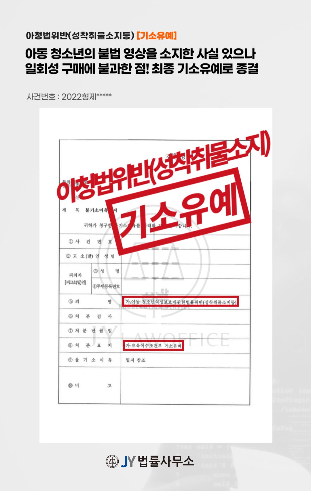 본 사건의 의뢰인은 성착취물소지등의 아청법 위반 혐의를 저질렀고, 이후 대응 방안을 자문하기 위해 JY법률사무소를 찾아오셨습니다.