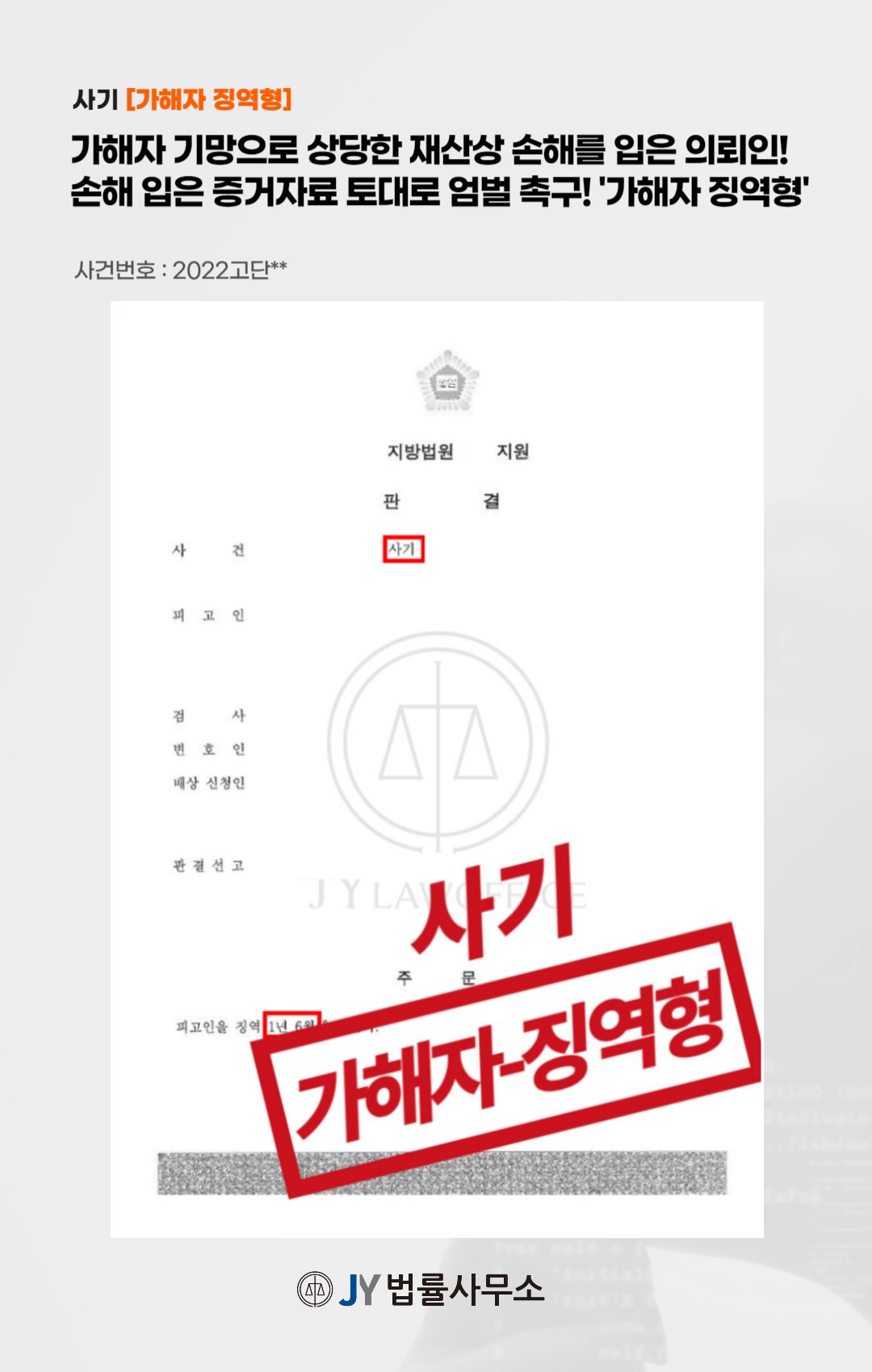본 사건의 의뢰인은 가해자의 기망으로 상당 금액의 재물을 교부하였으나, 이를 변제받지 못해 본 JY법률사무소를 찾아 사건을 정식 의뢰해주셨습니다