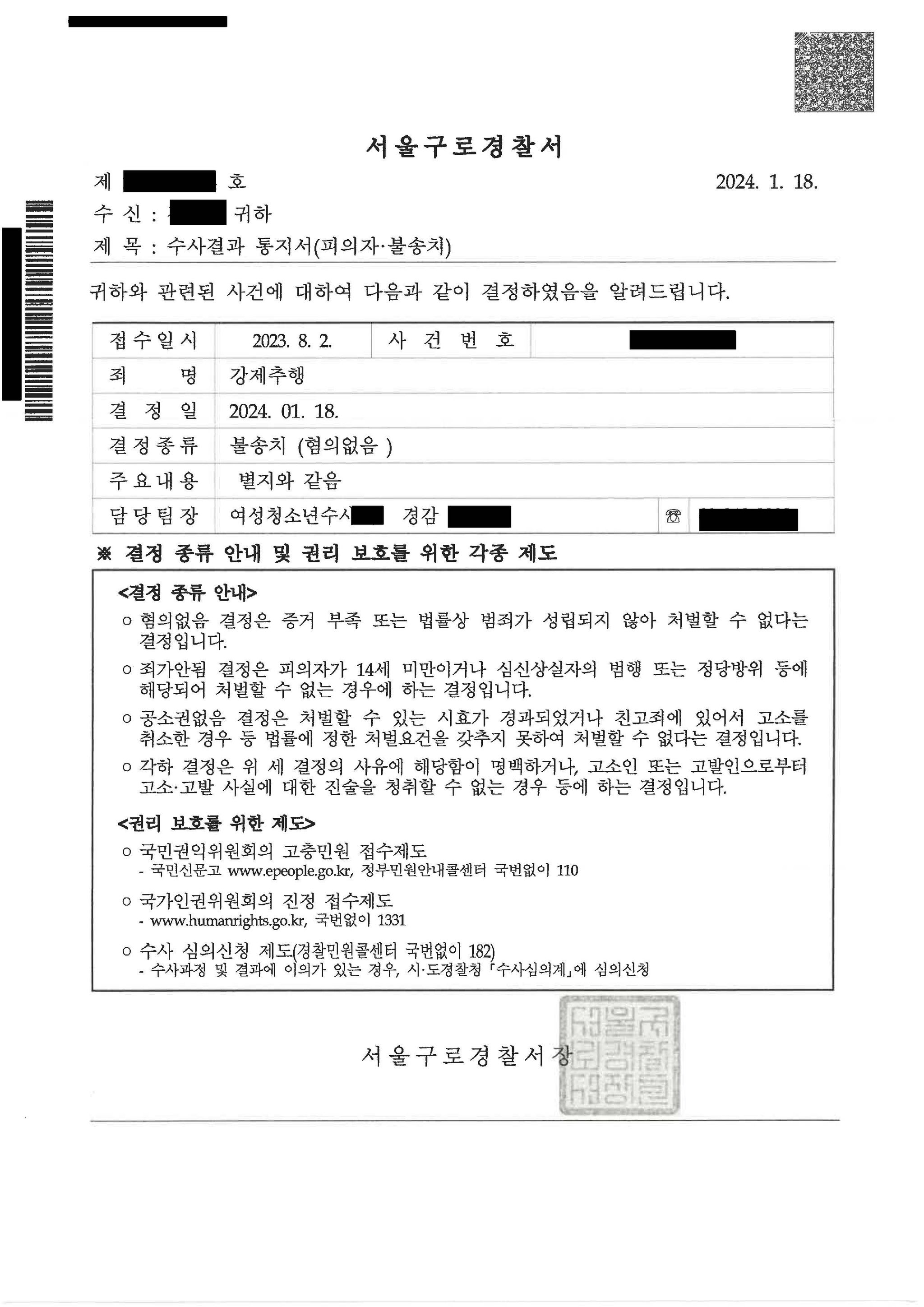 그 결과 의뢰인은 강제추행죄에 대하여 혐의없음 불송치 처분을 받을 수 있었습니다.
