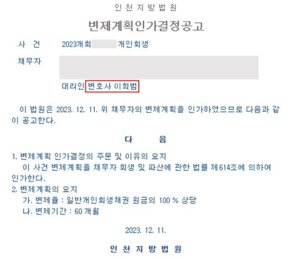 의뢰인의 경우에도 해당 절차를 안내해 드리고 우선 변제하여야 하는 채권을 일부라도 변제하여 총 변제금을 줄이는 방법을 안내해 드렸지만, 일부도 변제할 재정적 여유가 전혀 없으셨고 의뢰인 스스로도 원금을 전액 변제해도 무방하다고 하셨기에 원금 100%를 변제하는 변제계획안으로 개신신청을 하였고, 신청 5개월이 채 되지 않아서 개인회생 인가 결정을 무사히 받을 수 있었습니다.