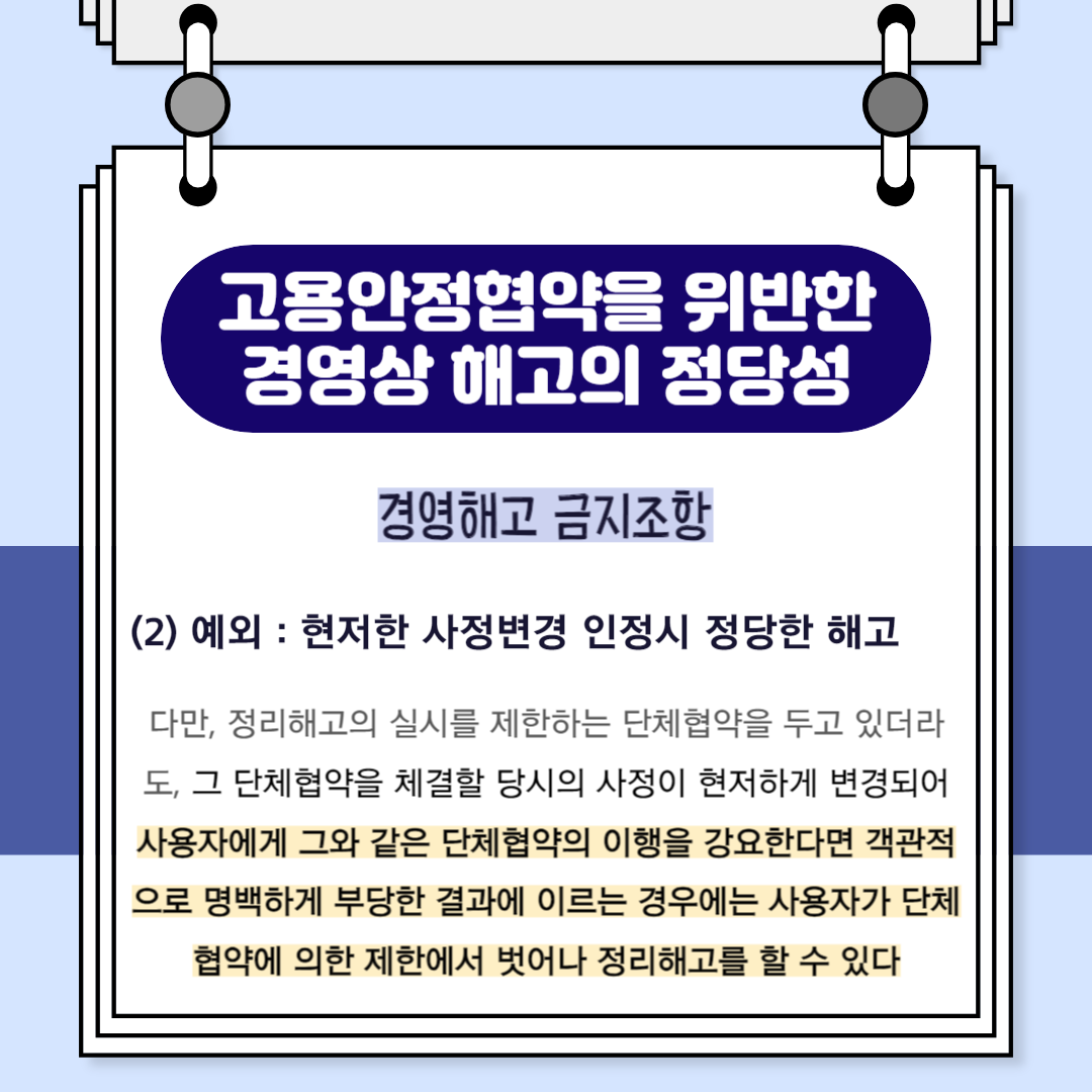 다만 이처럼 정리해고의 실시를 제한하는 단체협약을 두고 있더라도, 그 단체협약을 체결할 당시의 사정이 현저하게 변경되어 사용자에게 그와 같은 단체협약의 이행을 강요한다면 객관적으로 명백하게 부당한 결과에 이르는 경우에는 사용자가 단체협약에 의한 제한에서 벗어나 정리해고를 할 수 있다고 판시하였습니다.