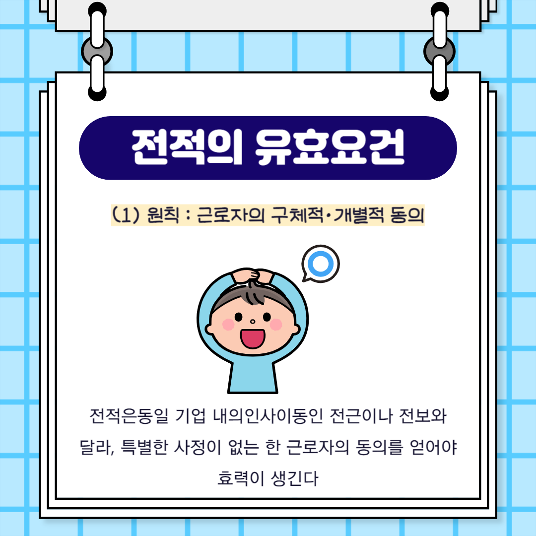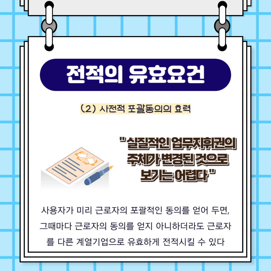 다만, 사용자는 근로계약 체결시에 근로자에 대하여 임금·근로시간·취업의 장소와 종사하여야 할 업무에 관한 사항 등의 근로조건을 명시하여야 되도록 규정되어 있으므로, 근로자의 포괄적인 사전동의를 받는 경우에는 ① 전적할 기업을 특정하고, ② 그 기업에서 종사하여야 할 업무에 관한 사항 등의 기본적인 근로조건을 명시하여 근로자의 동의를 얻어야 된다고 판시하여 포괄적 동의 방법에 제한을 두었습니다.
