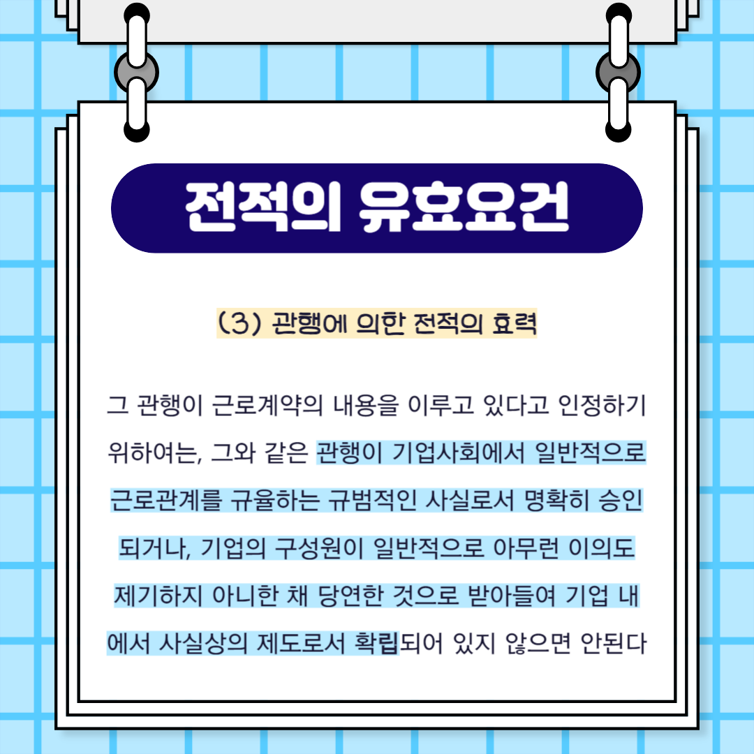 사용자가 근로자의 동의를 얻지 아니하고 기업그룹 내의 다른 계열회사로 근로자를 전적시키는 관행이 있어서 그 관행이 근로계약의 내용을 이루고 있다고 인정하기 위하여는, 그와 같은 관행이 기업사회에서 일반적으로 근로관계를 규율하는 규범적인 사실로서 명확히 승인되거나, 기업의 구성원이 일반적으로 아무런 이의도 제기하지 아니한 채 당연한 것으로 받아들여 기업 내에서 사실상의 제도로서 확립되어 있지 않으면 안된다고 판시하였습니다.