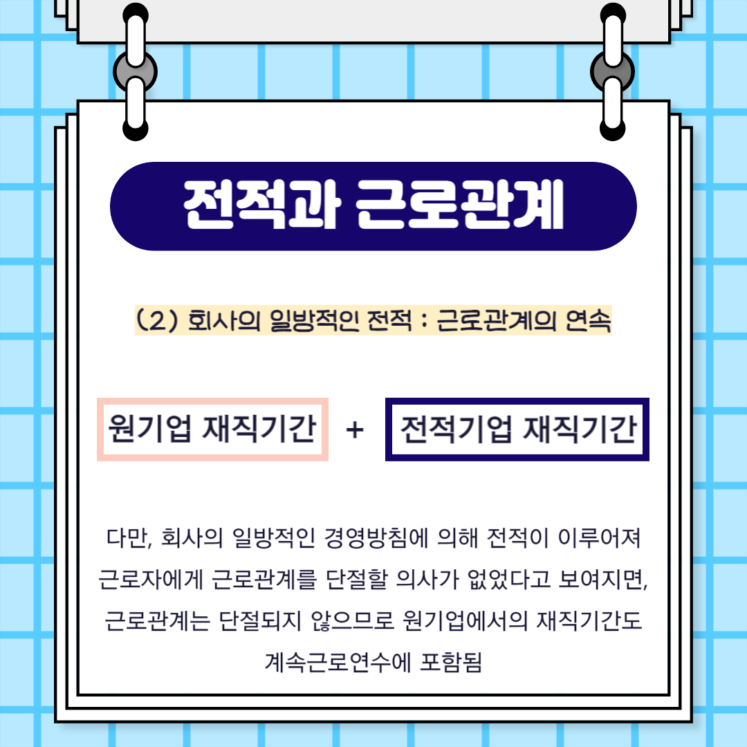 다만, 회사의 일방적인 경영방침에 의해 전적이 이루어져 근로자에게 근로관계를 단절할 의사가 없었다고 보여지면, 근로관계는 단절되지 않으므로 원기업에서의 재직기간도 계속근로연수에 포함됩니다.