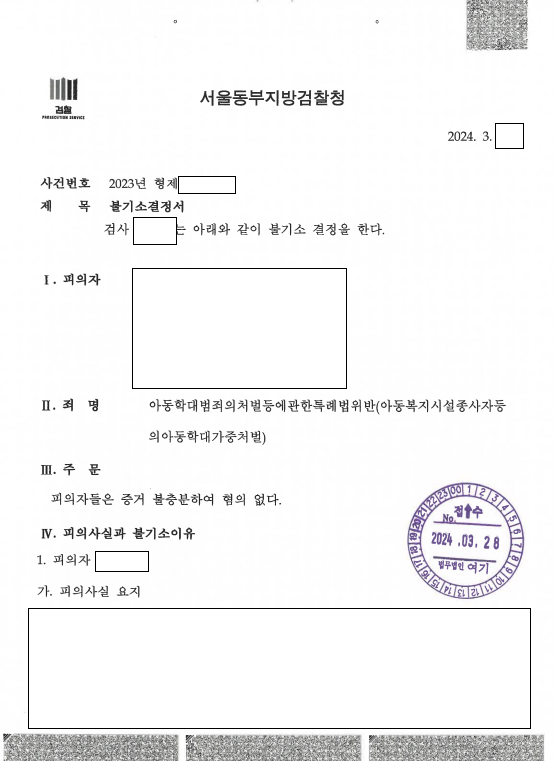 오늘은 꽤 오랜시간 검찰에서 검토를 했던 사안에 대해 성공사례 포스팅을 합니다. 바로 아동학대범죄의처벌에 관한 특례법위반(아동복지시설종사자등의 아동학대가중처벌)이고, 전부 혐의없음 처분을 받았습니다.