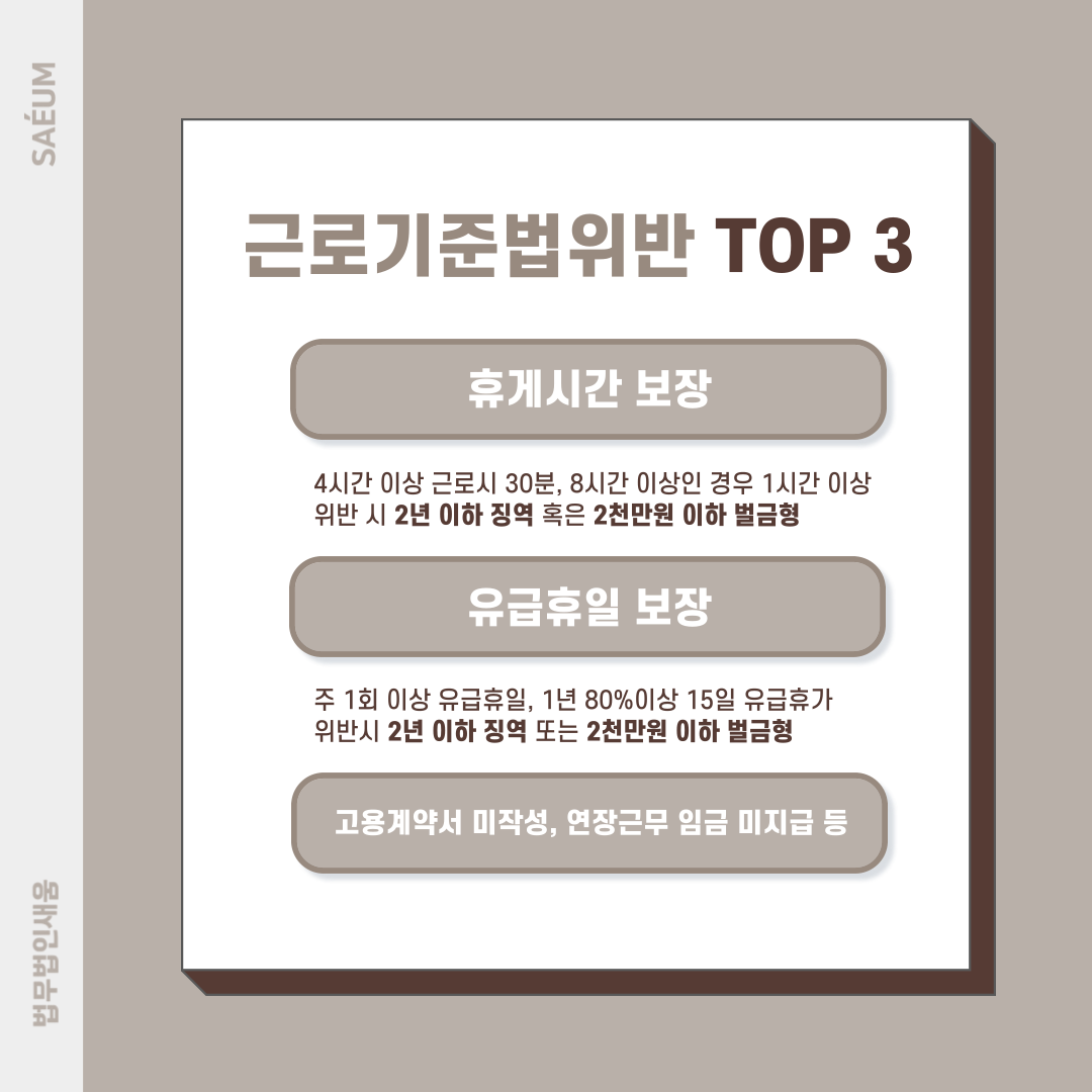이 밖에도 고용계약서를 작성하지 않거나 연장근무의 임금을 지급하지 않는 등의 행위도 모두 근로기준법에 어긋나는 행위이며, 이에 따라 합당한 처벌을 받게 됩니다.