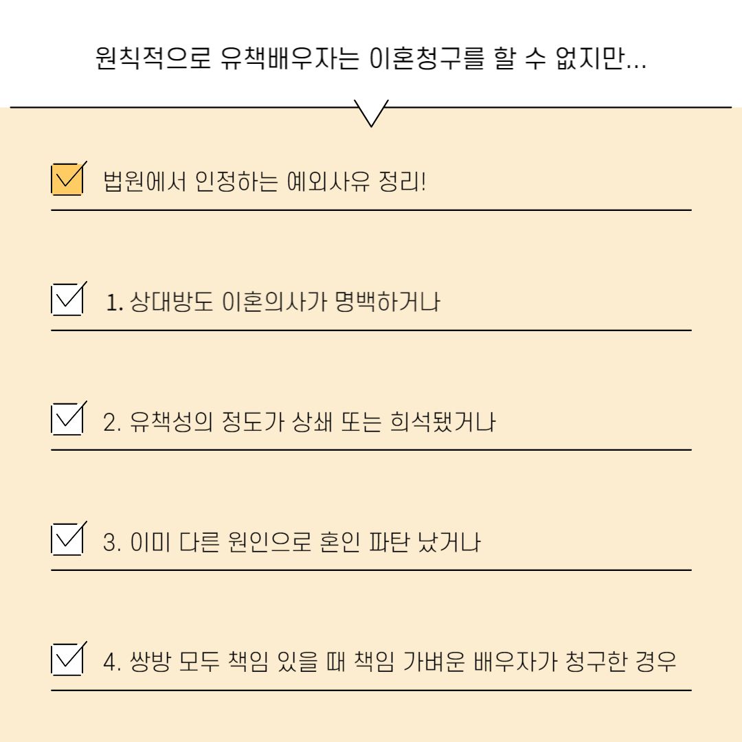 결론부터 말씀드리자면, 유책배우자(혼인 관계에서 주된 잘못을 저지른 배우자를 말합니다.)가 법원에 이혼소송을 제기하는 것이 무조건 금지되는 것은 아닙니다.
