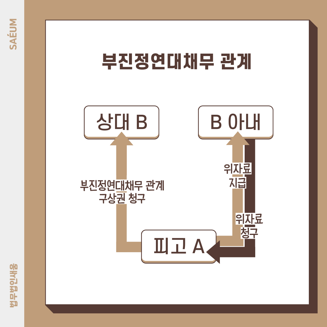 일부 과실이 인정되어 위자료를 지급해야 하는 경우 대처하는 방법이 있습니다. 바로 위자료에 대해 상대 B에게 책임을 분배해 나눠 부담하라는 구상 청구를 하는 것입니다. 피고 A와 상대 B는 ‘부진정연대채무관계’에 있기 때문입니다.