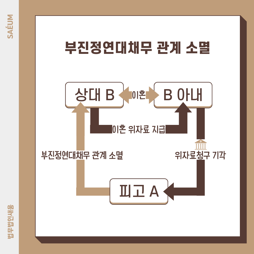 이때, 재판부는 원고가 요구한 위자료청구를 기각할 것입니다. 상대 B의 변제로 피고 A의 채무가 사라졌다고 판단할 것이기 때문입니다. 이처럼 부진정연대채무관계를 어떻게 활용하느냐에 따라 위자료청구를 기각할 수 있습니다.