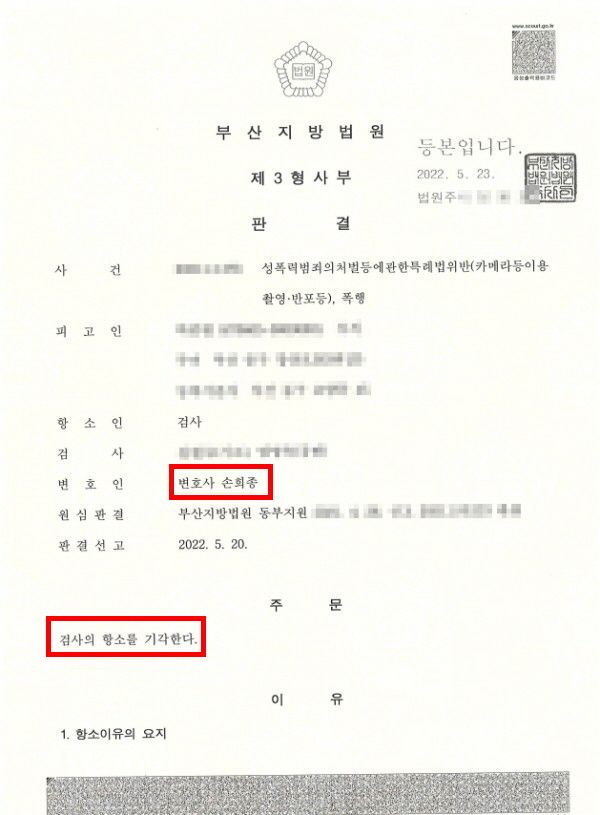 이에 법률사무소 위인의 손희종 변호사는 카메라등이용촬영죄를 비롯하여 다수의 성범죄 사건을 전략적으로 수행해 온 경험과 노하우를 살려 검사 측의 양형부당 항소에 적극 대응하였고 결국 '항소 기각'이라는 성공적인 결과를 이끌어낼 수 있었습니다.