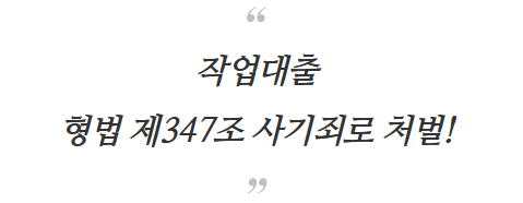 작업대출을 하게 되면, 기본적으로 형법상 사기죄가 적용이 됩니다. 만약 피해액이 5억 이상이라면 특경사기(사기의 가중처벌)로 처벌을 받을 수 있기 때문에 유의하셔야 합니다.